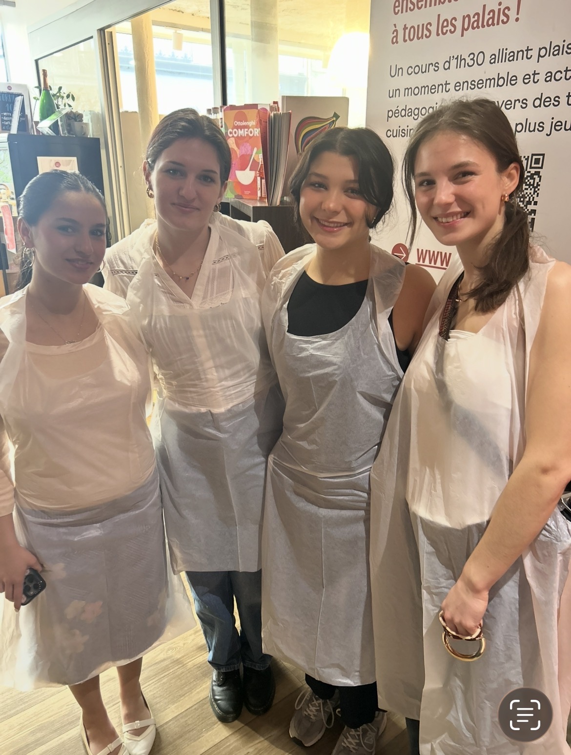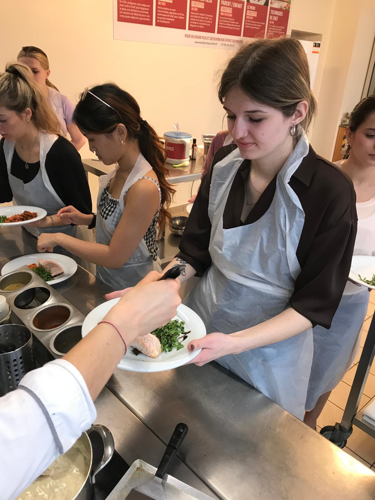 Lilah, Emma, Sarah, and Lily are ready for the cooking classOlivia hoding her plated dish out for the chef to add sauce