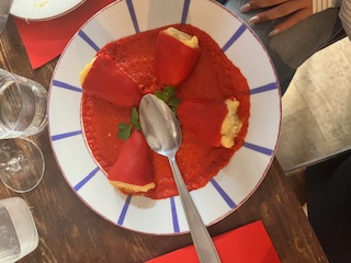 To end our food tour, we sat down together for a full meal where we were able to try a variety of French foods. We began by warming up with fresh bread and duck liver pâté, paired with white wine. For my entrée, I chose cod-stuffed red peppers with a creamy red pepper sauce. I can honestly say it was one of the best things I have ever eaten. After that, we enjoyed a tasting of different meats, with my personal favorite being the chorizo, which paired perfectly with a glass of red wine. We also sampled several cheeses, and the goat cheese was definitely a standout. Finally, we ended the meal with dessert: a delicious cake from Pierre Hermé, bringing our food tour full circle.