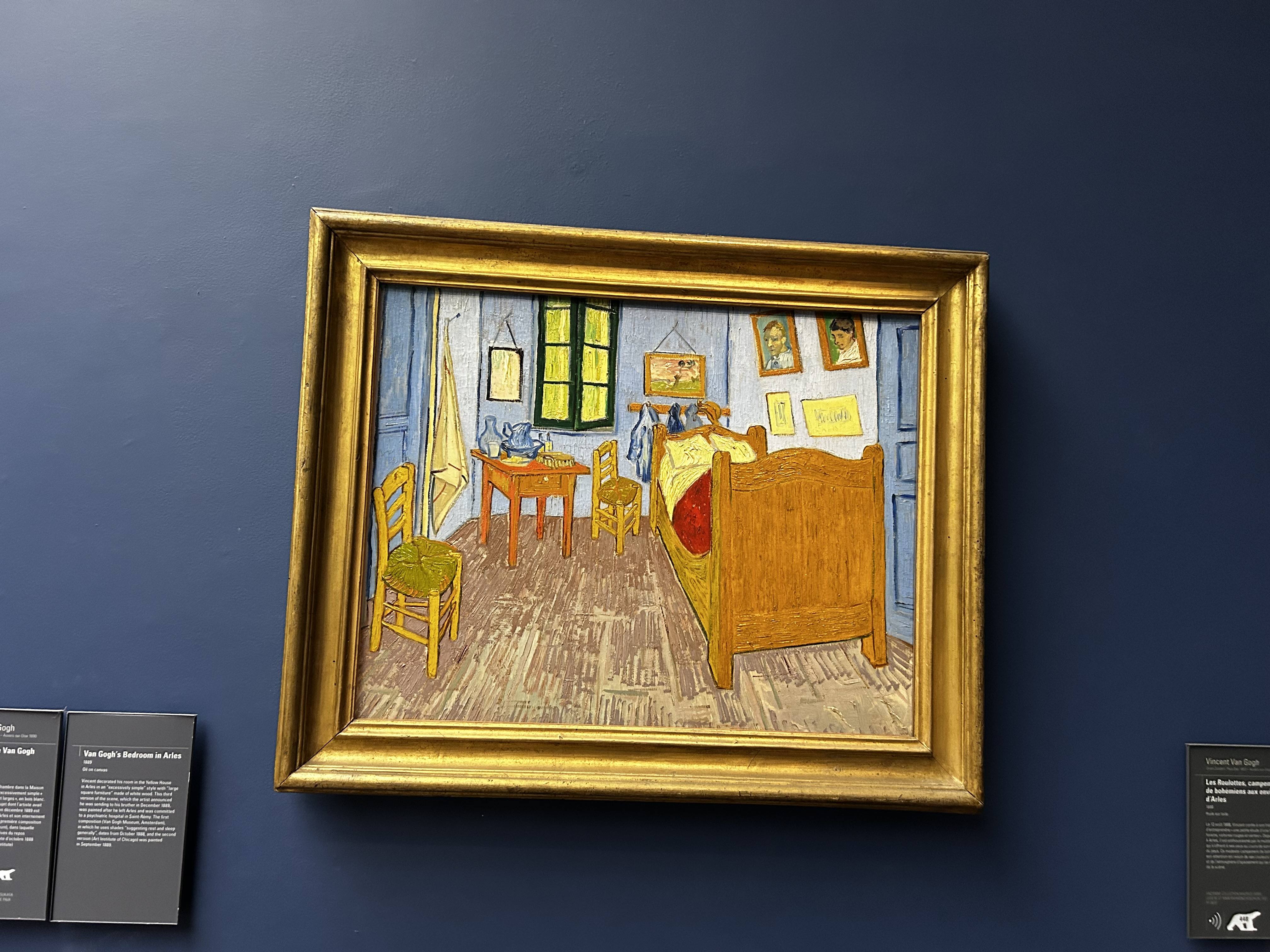 Some of my favorite paintings are by Vincent van Gogh, pictured below. The first picture is The Church at Auvers, which was a surprise and delight to see. The Church at Auvers is a painting by van Gogh that was featured in the Doctor Who episode about the artist- I was extremely excited to see it in real life. The second picture is Bedroom in Arles, a remarkably famous work of his that is often referenced alongside his name. The third picture below this paragraph is one of his many self-portraits.