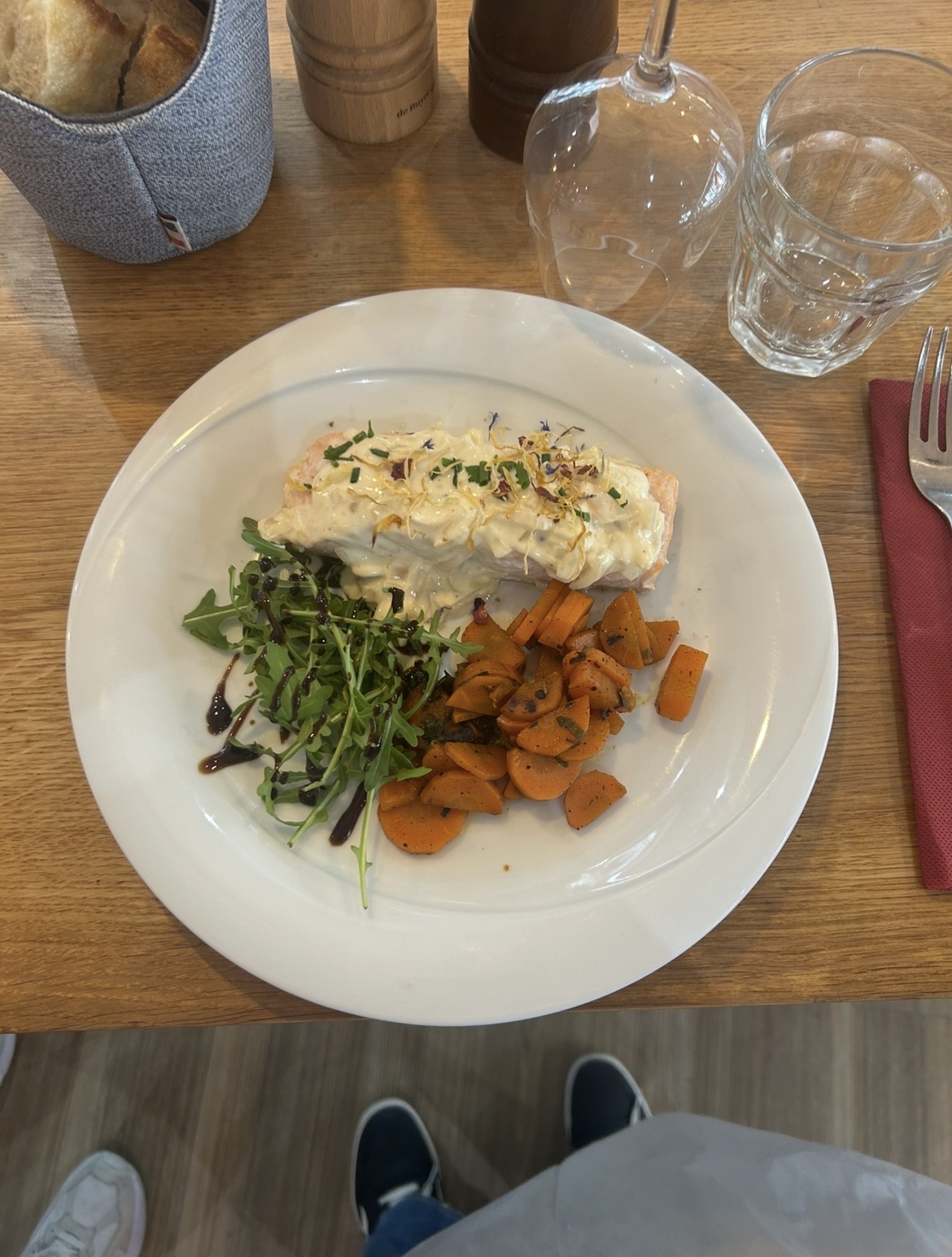 Salmon Fillet with white wine sauce and braised carrots, garnished with chives and edible flowers