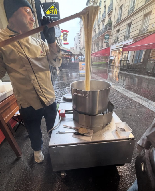 The second cheese we got ended up not being completely cheese at all. It is technically a sort of mashed potato like dish called “Pommes Aligot.” It is mashed potatoes mixed with cheese, garlic, cream, pepper, and other spices. It was genuinely delicious and the man who made it used a huge wooden paddle to mix it. It was super cool and definitely a highlight of Paris cuisine. It was super cheap, too. I reasonably sized tub was only euros. Down below is an image of the man making the food with his huge wooden paddle.